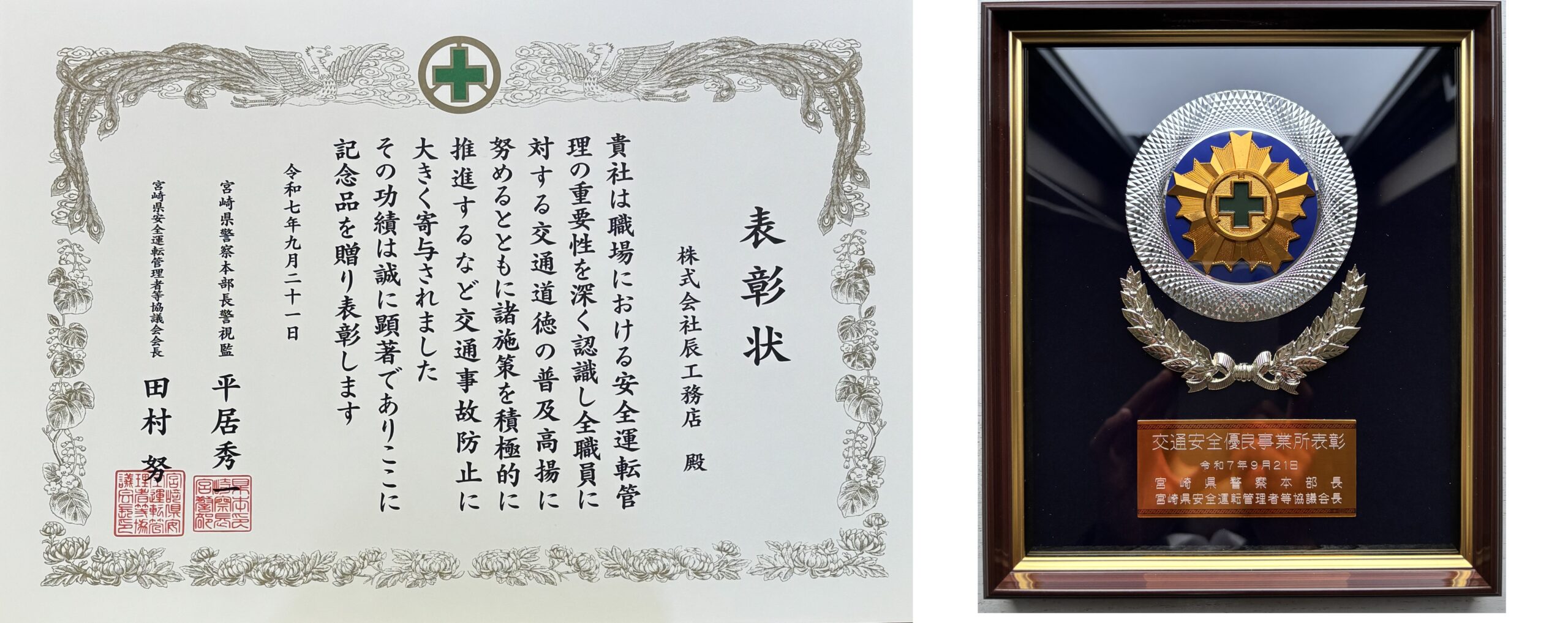 令和7年度「交通安全優良事業所表彰」を受彰しました 投稿日 2025年11月25日 著者 tatsukomuten カテゴリー 辰だより 令和7年11月20日、令和7年度における安全運転管理・交通事故防止等の活動が評価され宮崎県警察本部長・宮崎県安全運転管理者等協議会長連名より「交通安全優良事業所」として表彰を受けました。今後も社員一同、安全運転の意識を高め、交通事故防止に努めてまいります。